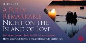 Join us for an unforgettable full moon evening of acoustic melodies by Piret Krumm and delectable dining by renowned chef Achim Braitsch. After the 3-course dinner, rowing boats take us across Pädaste Bay to the Island of Love with the magical full moon guiding our way through the shimmering sea for the concert that continues into the wee hours.